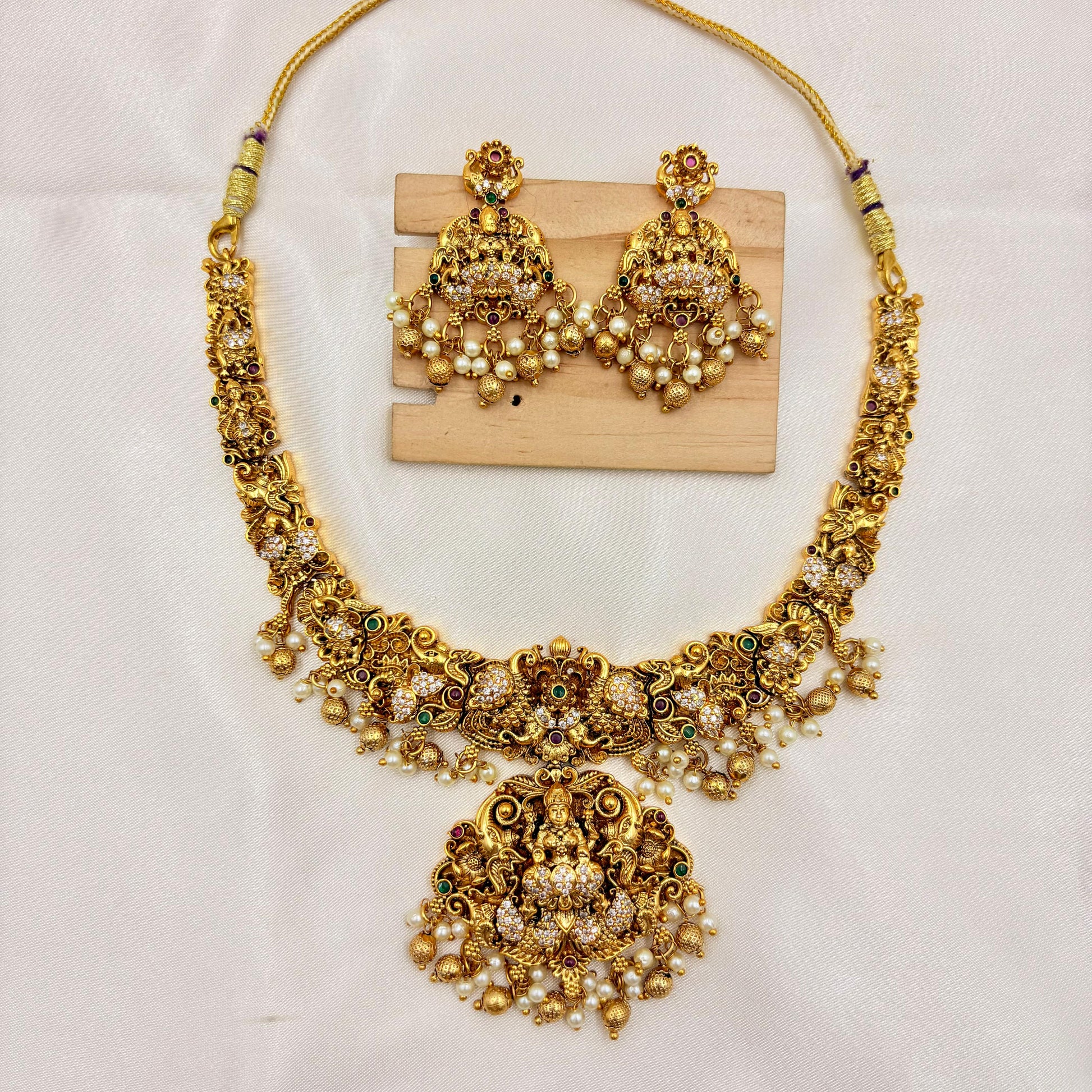 This exquisite antique Lakshmi necklace set features intricate carvings, premium micro gold polish, sparkling stones, and beautifully layered pearl droplets.