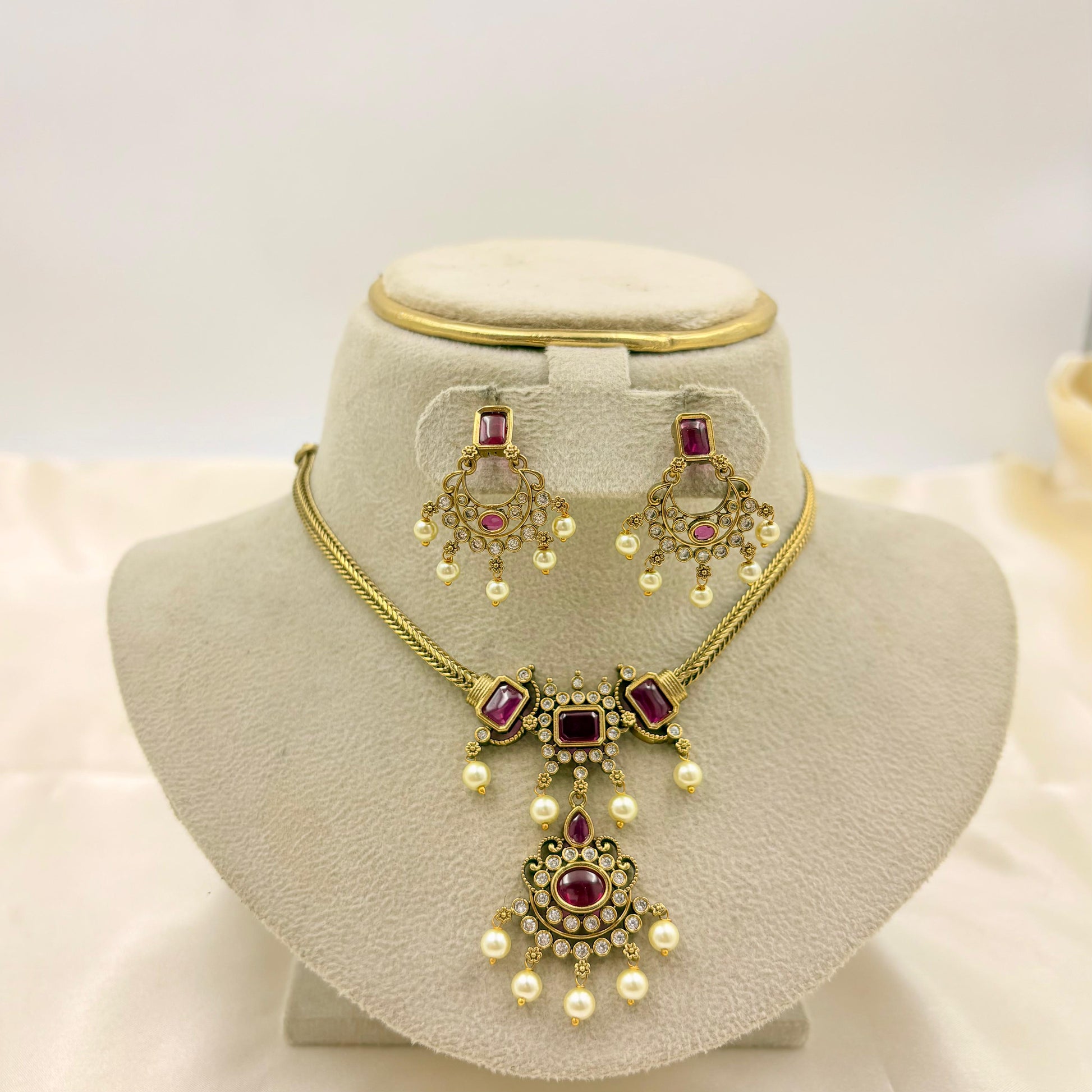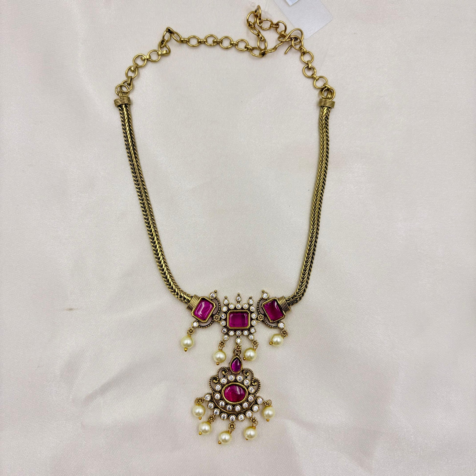 Pink Kundan Jhumka Earrings with Gold Beads โ Antique Gold Finish