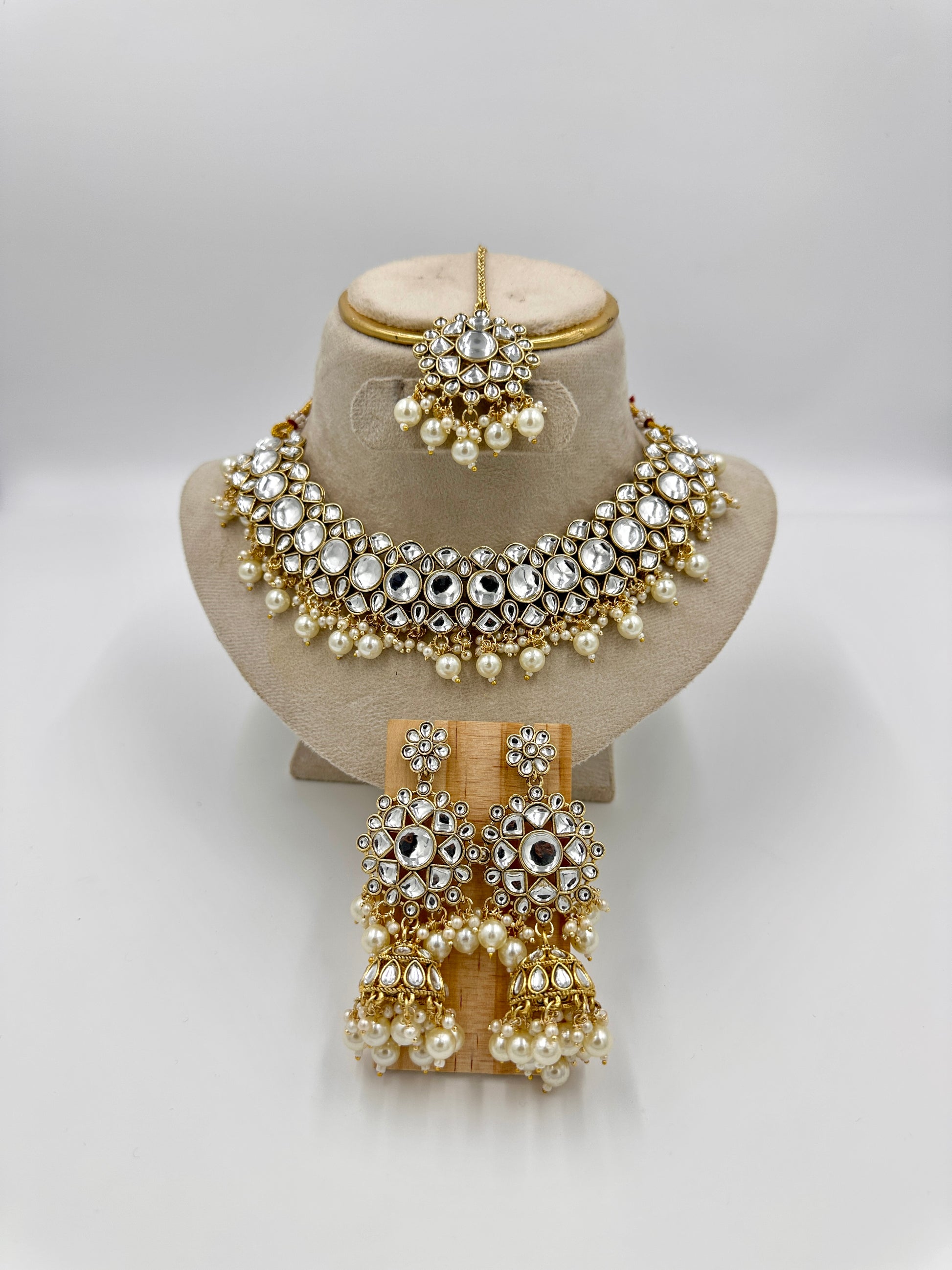 The set includes a matching pair of jhumka earrings and a maang tikka, making it a complete choice for weddings, festive celebrations, and bridal occasions.