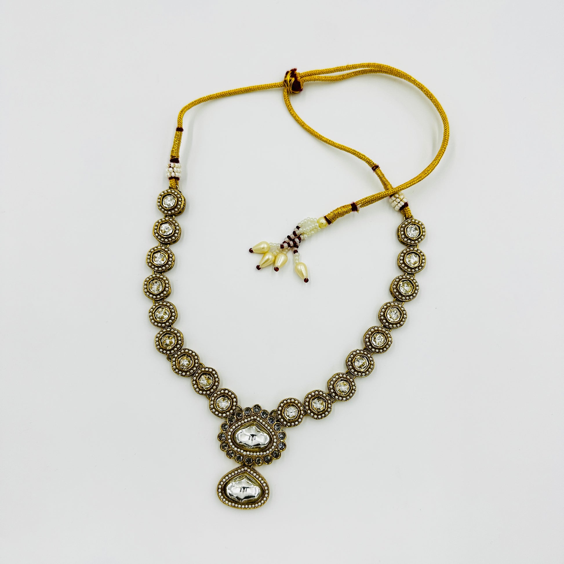 Add timeless elegance to your festive and bridal wardrobe with this antique gold-plated Kundan necklace set.