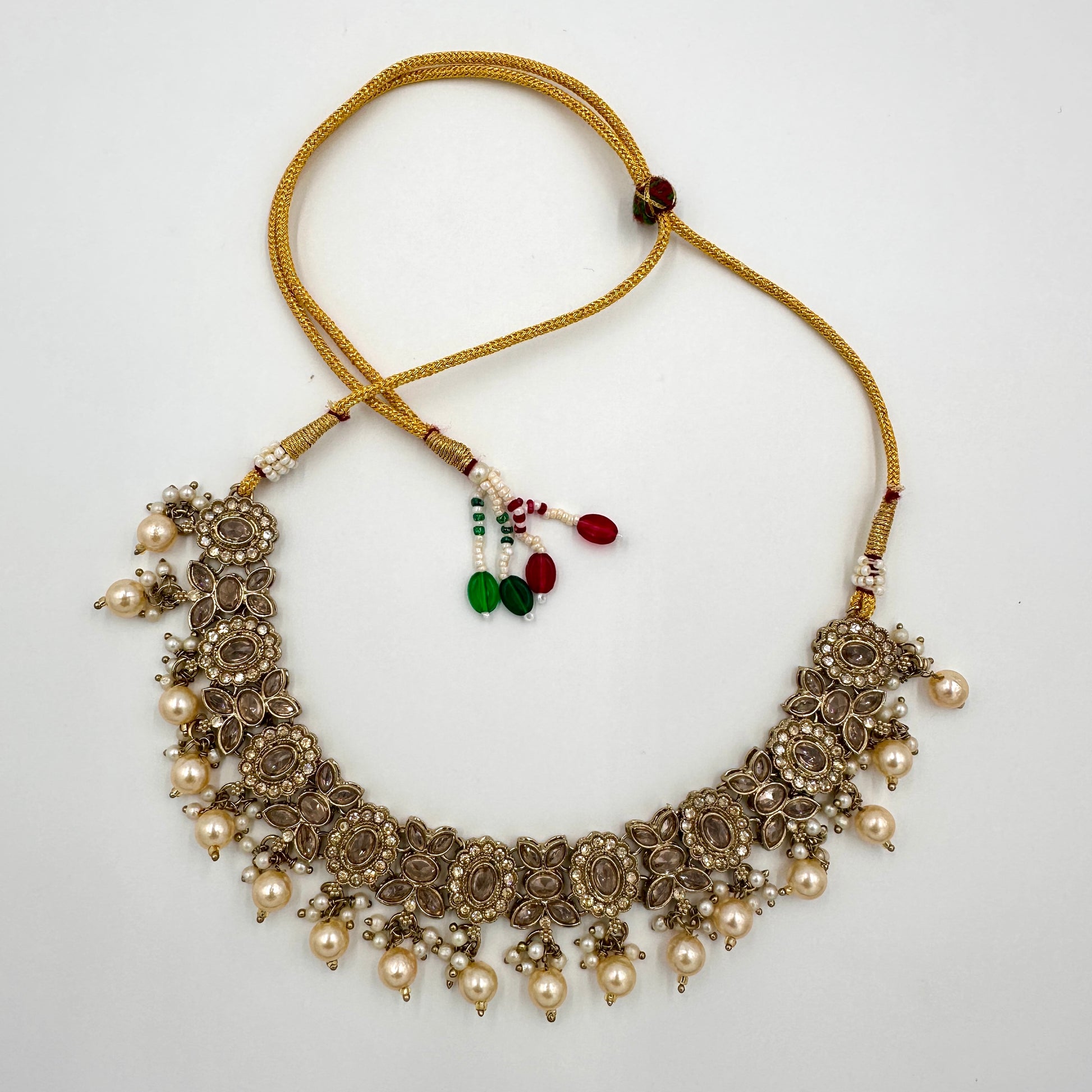 Elevate your ethnic look with this antique gold-plated choker necklace set, designed with intricate floral motifs and adorned with luminous pearls.