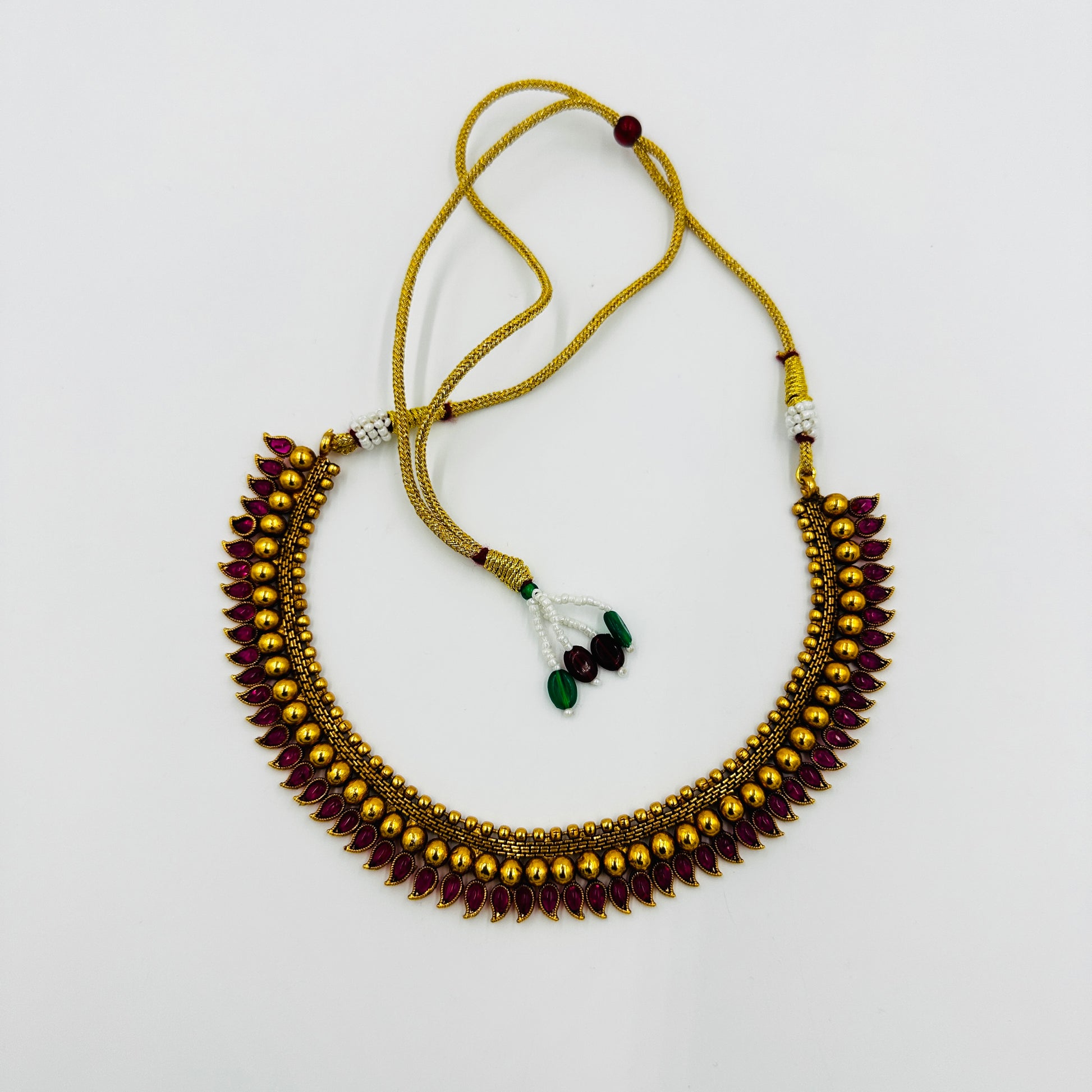 The necklace is designed with red ruby-colored stones in teardrop motifs, bordered by golden beads for a regal finish. Paired with matching earrings, this set is perfect for weddings, festive occasions, and cultural events.