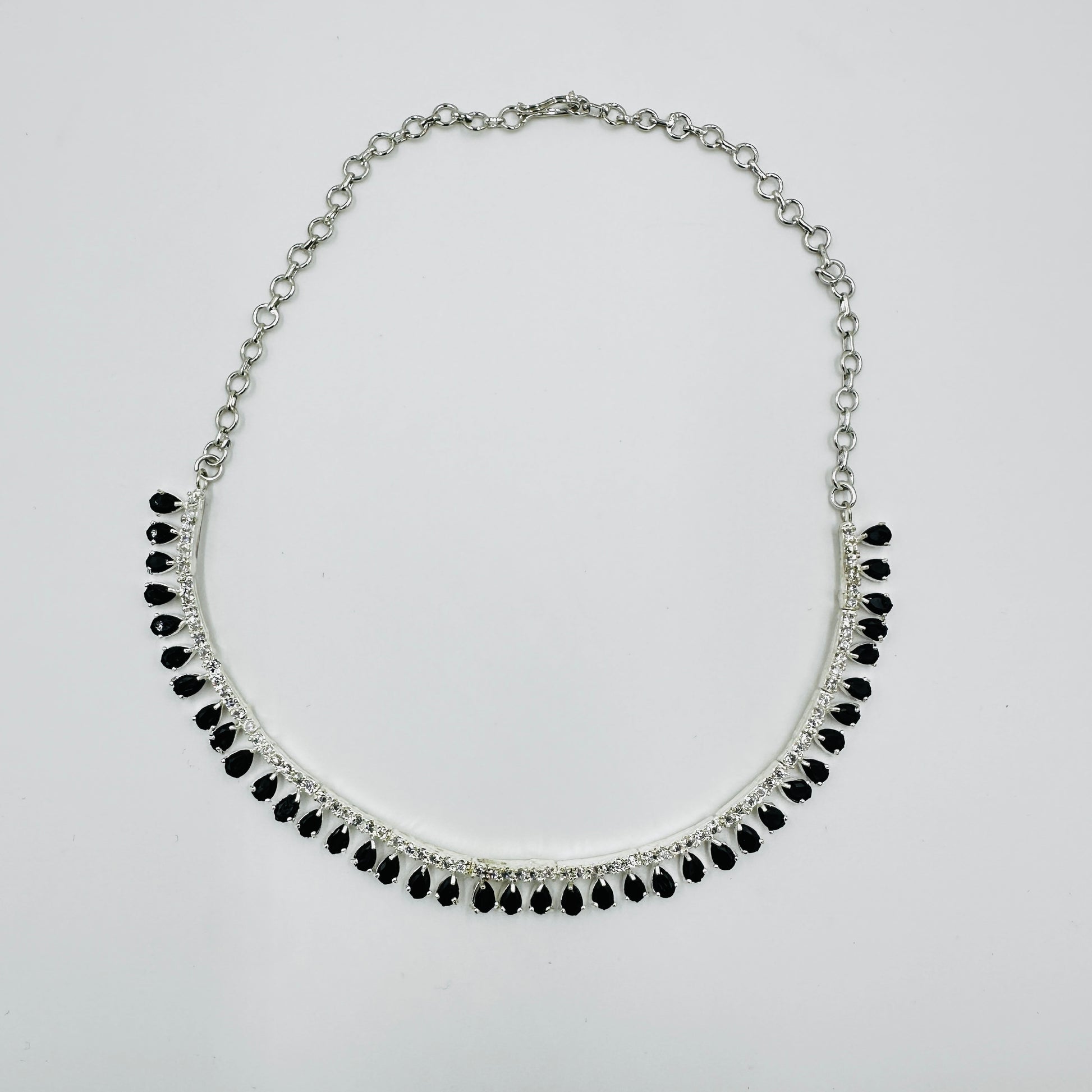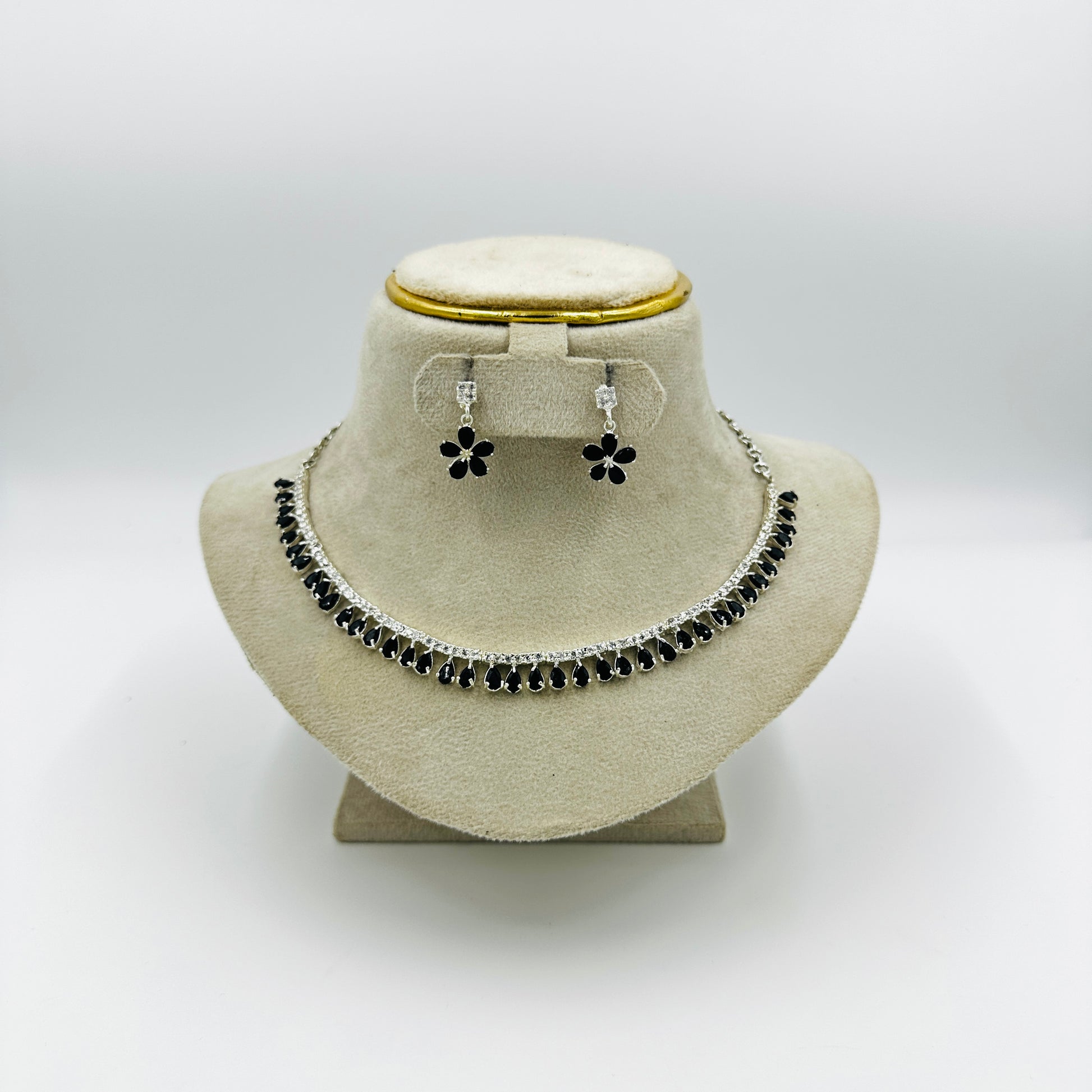 Elevate your style with this Black Stone Floral Necklace Set, featuring a beautifully designed necklace and matching floral earrings. The silver-toned chain is adorned with black teardrop stones bordered by shimmering white accents, creating a stunning contrast. The floral earrings complement the necklace perfectly, making it ideal for weddings, parties, and festive occasions. Lightweight and versatile, this set is a must-have in your jewelry collection.
