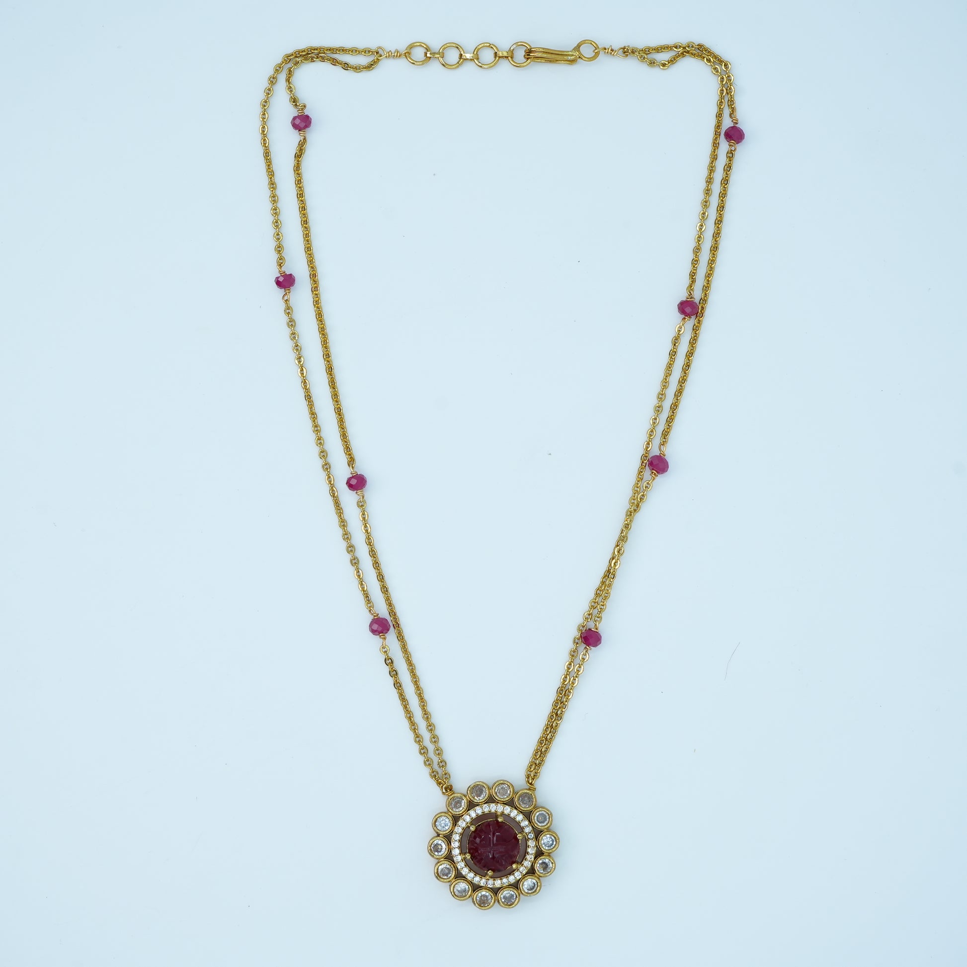 Crafted with an antique gold finish and a beautifully carved ruby-red stone centerpiece, surrounded by sparkling white CZ stones, this necklace exudes charm and class.