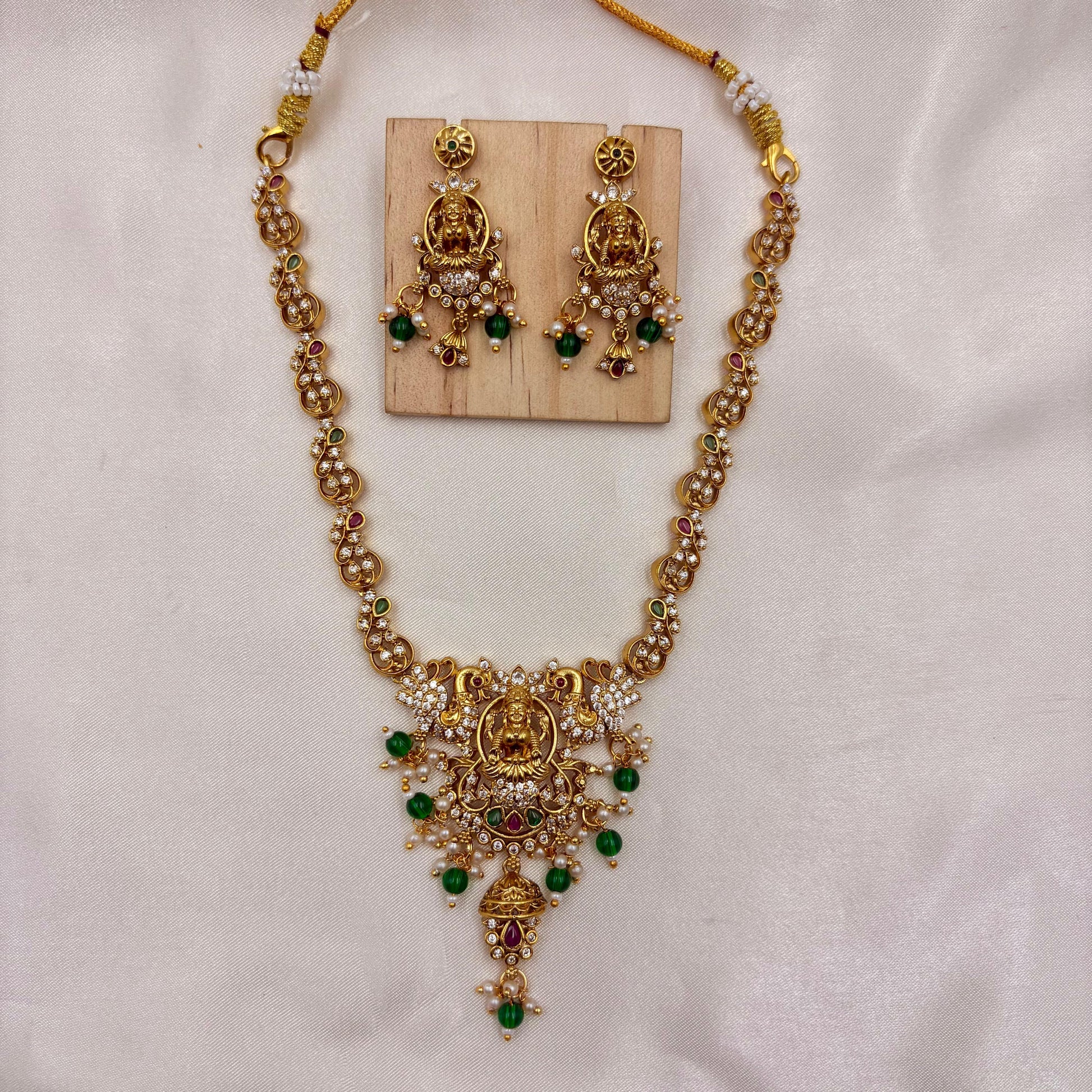 Bring home the grace of tradition with this exquisite Lakshmi Temple Necklace Set, crafted with intricate detailing and adorned with shimmering stones, pearls, and rich green beads. The beautifully sculpted Lakshmi pendant symbolizes prosperity and blessings, making this set ideal for festive and spiritual occasions.