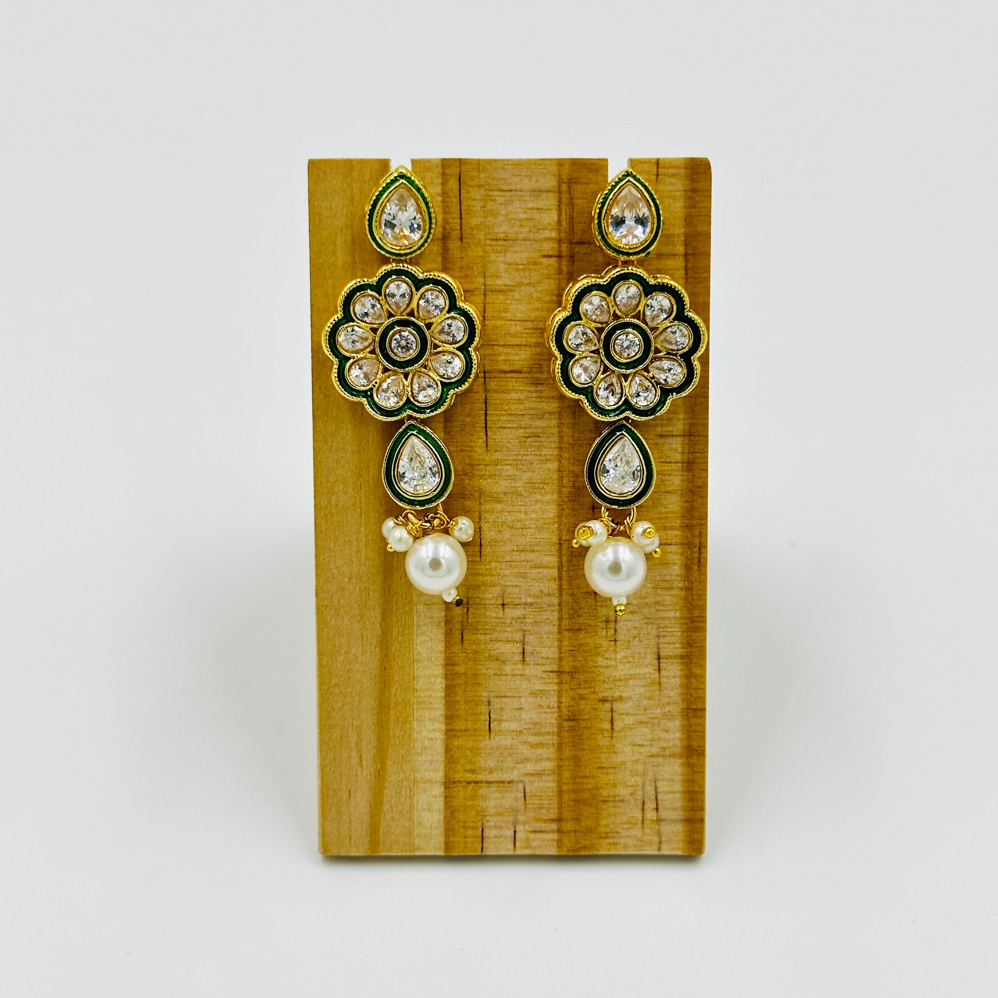 The gold-plated necklace is adorned with sparkling white stones, delicate green enamel accents, and finished with pearl drop detailing. Paired with matching long statement earrings, this set adds timeless elegance to weddings, festive occasions, and cultural celebrations.