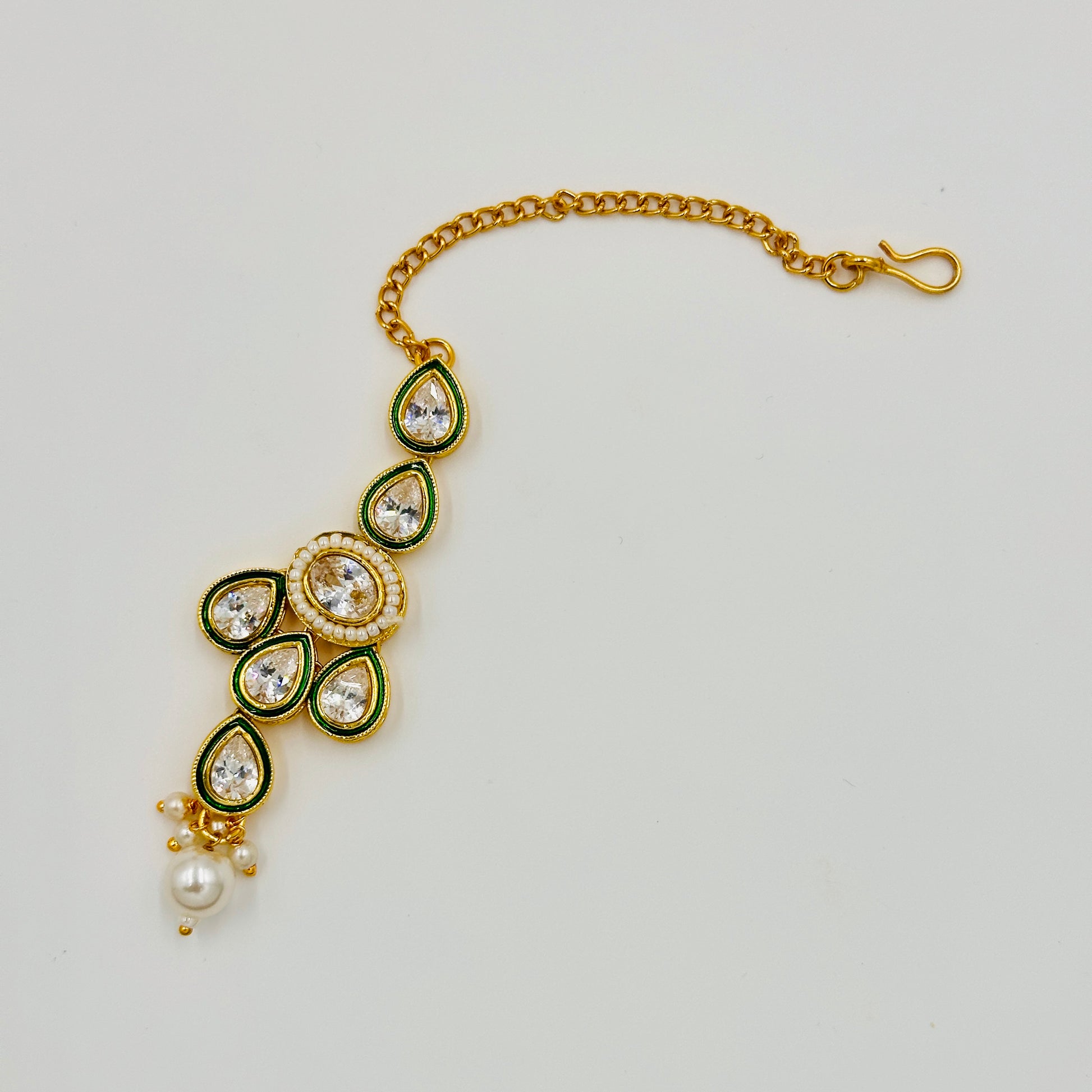 This complete set includes matching earrings and a maang tikka, making it ideal for weddings, festive events, and traditional celebrations.