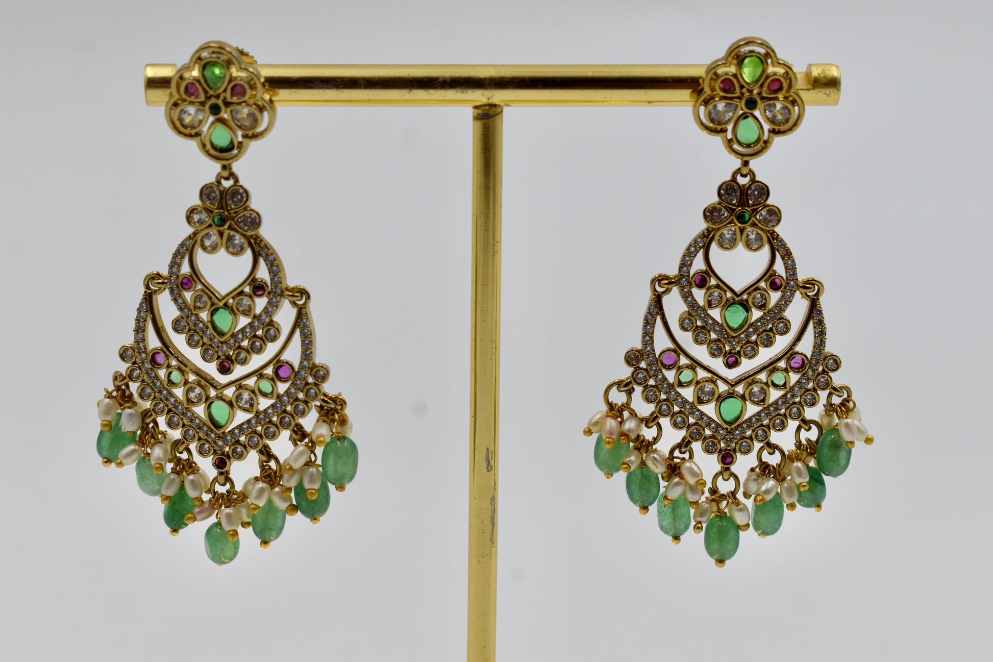 Embellished with multicolor kundan stones, sparkling CZ crystals, and dangling green beads with pearls, these earrings are a statement piece for weddings, parties, and traditional celebrations.