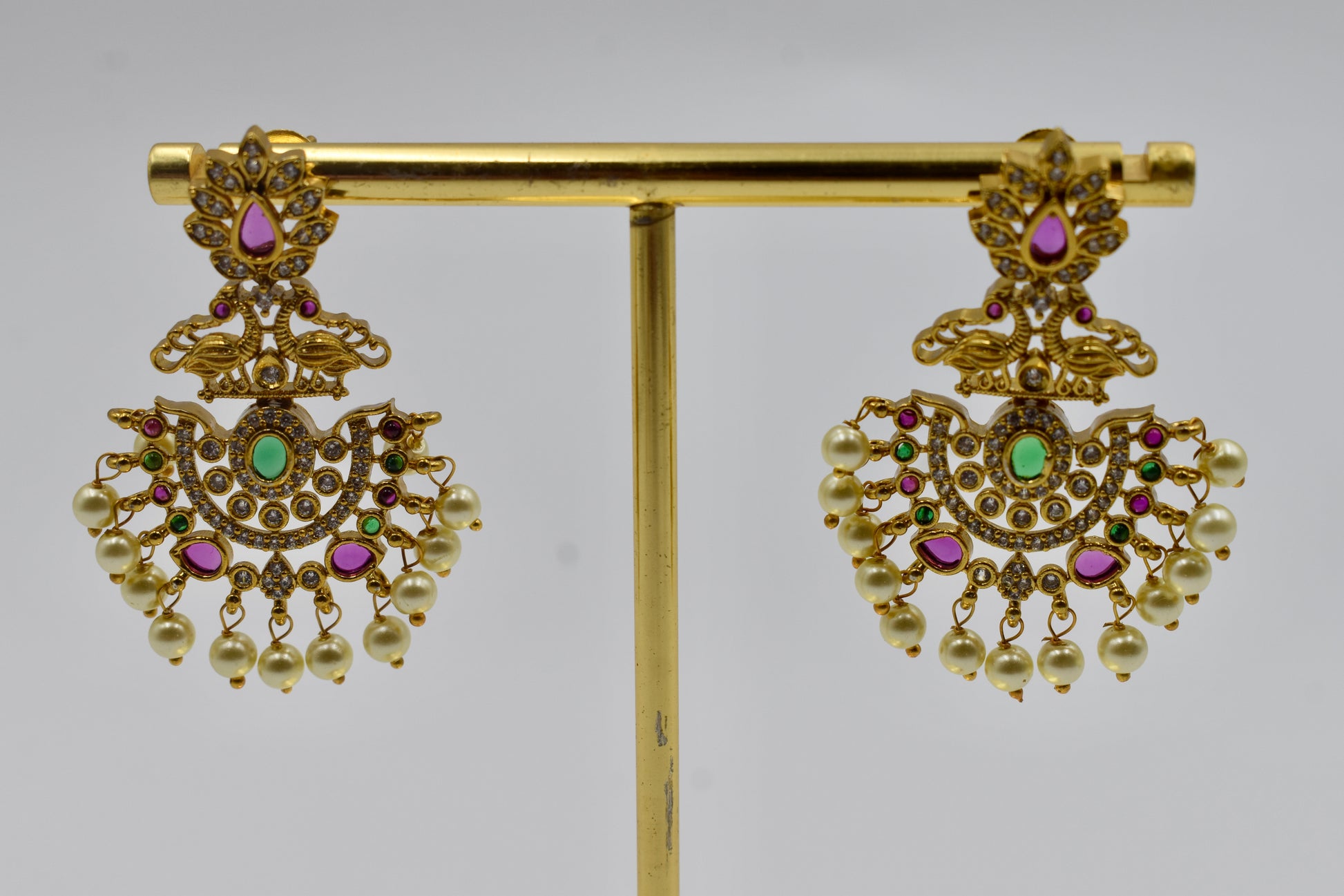 Elevate your ethnic and festive look with these traditional gold-plated temple design earrings. Featuring intricate peacock motifs, ruby red and green stones, and elegant pearl drops, these earrings are perfect for weddings, traditional functions, and festive celebrations.