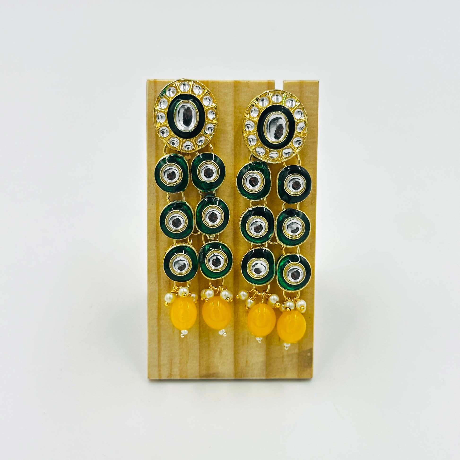 Adorned with sparkling white Kundan stones bordered by green enamel, this necklace is finished with bright yellow bead drops for a vibrant festive appeal. The set comes complete with matching earrings and a maang tikka, making it a perfect choice for weddings, haldi ceremonies, festive events, and grand celebrations.