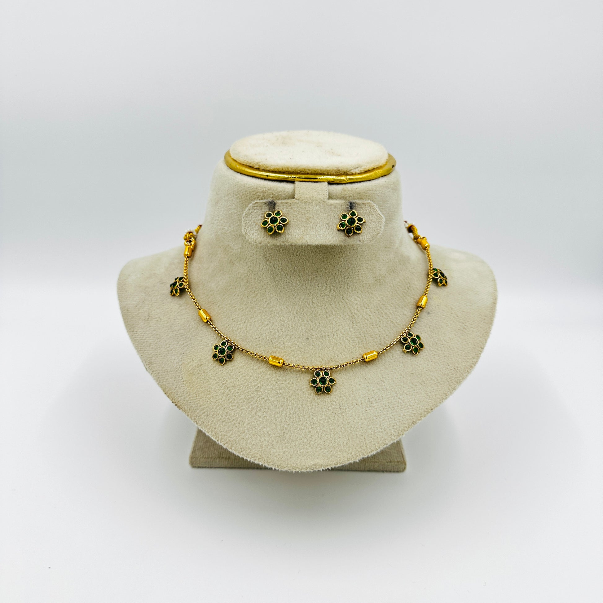 The gold-tone necklace is beautifully crafted with dainty floral motifs embellished with green stones, paired with matching stud earrings.