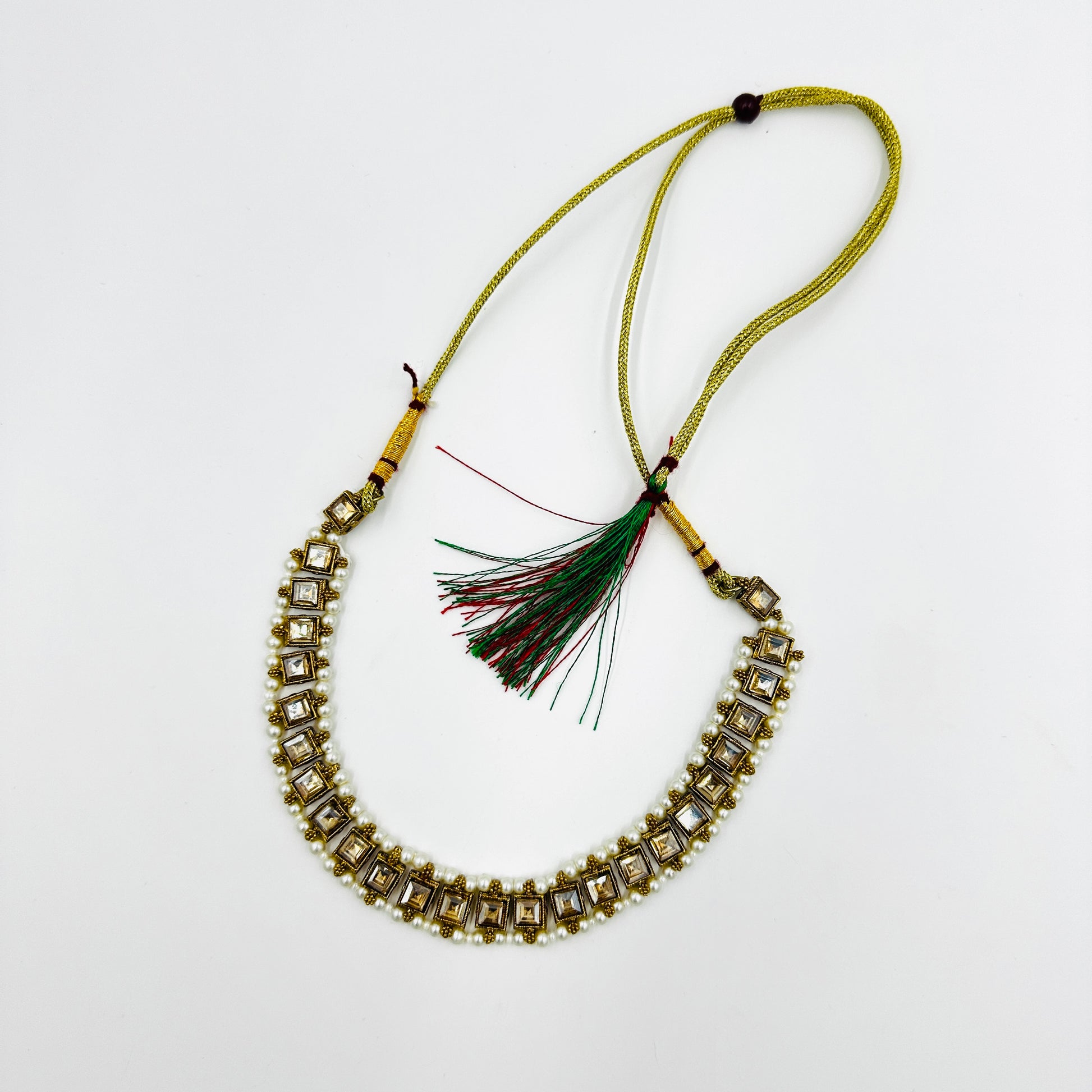 The necklace is crafted with square and teardrop Kundan stones bordered by pearls, giving it a regal and timeless charm.