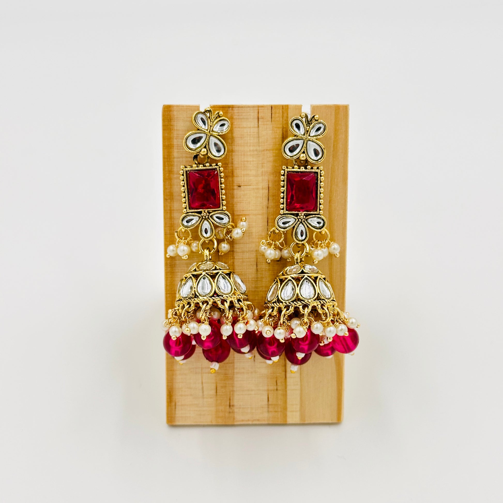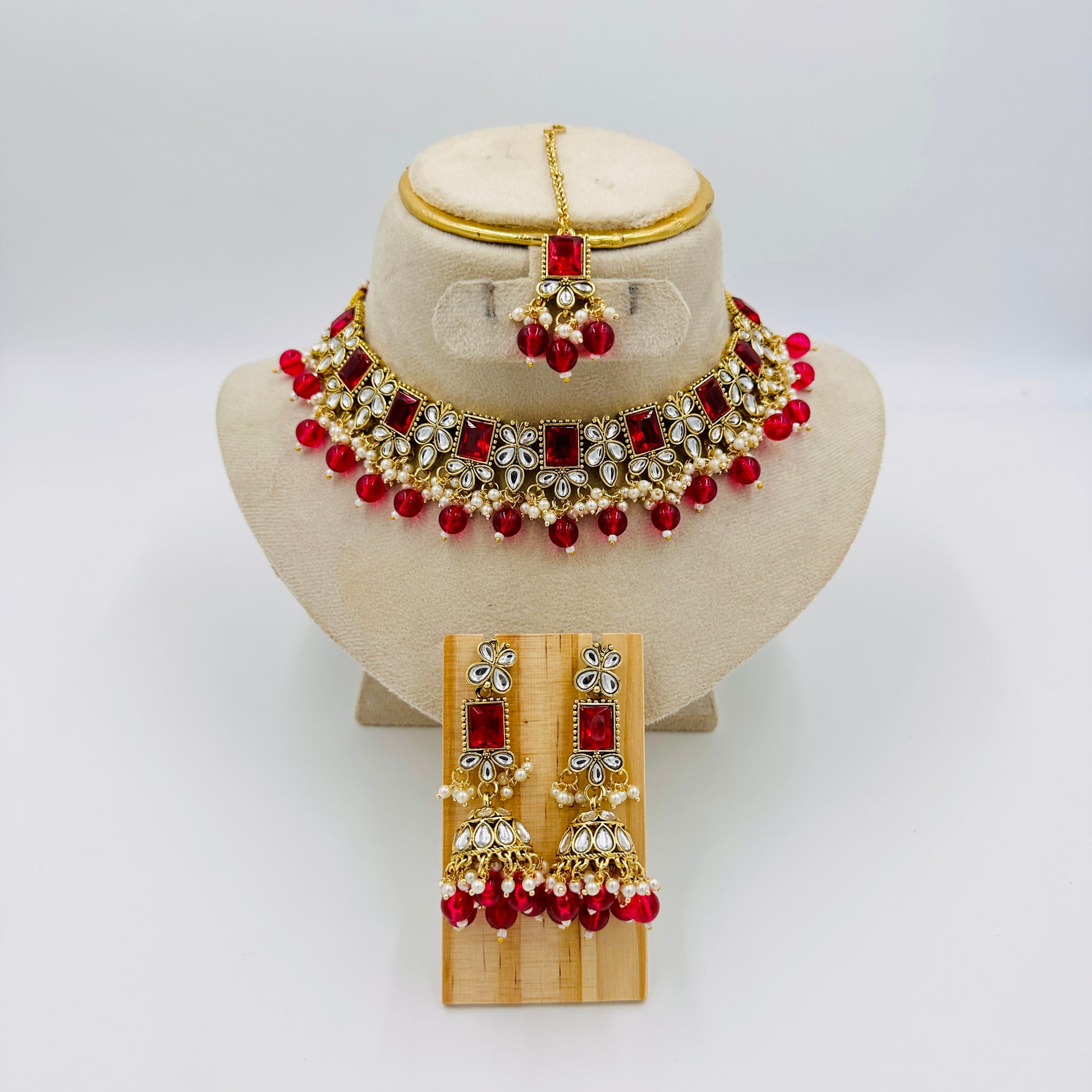 Crafted with antique gold plating and adorned with sparkling Kundan stones, pearls, and ruby red beads, this set includes a statement choker necklace, matching jhumka earrings, and a coordinated maang tikka. Perfect for bridal wear, festive functions, or special occasions.