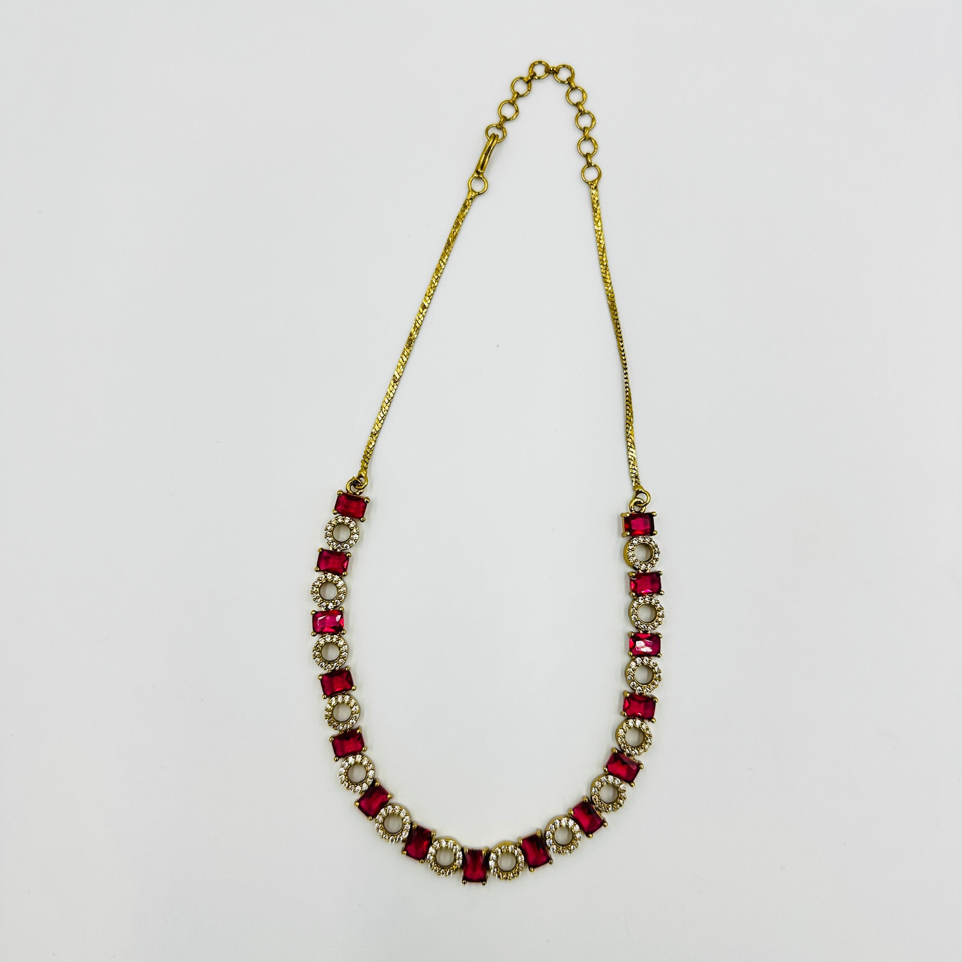 The necklace is crafted with alternating ruby-red square stones and sparkling circular crystals, creating a perfect blend of traditional charm and modern sparkle.