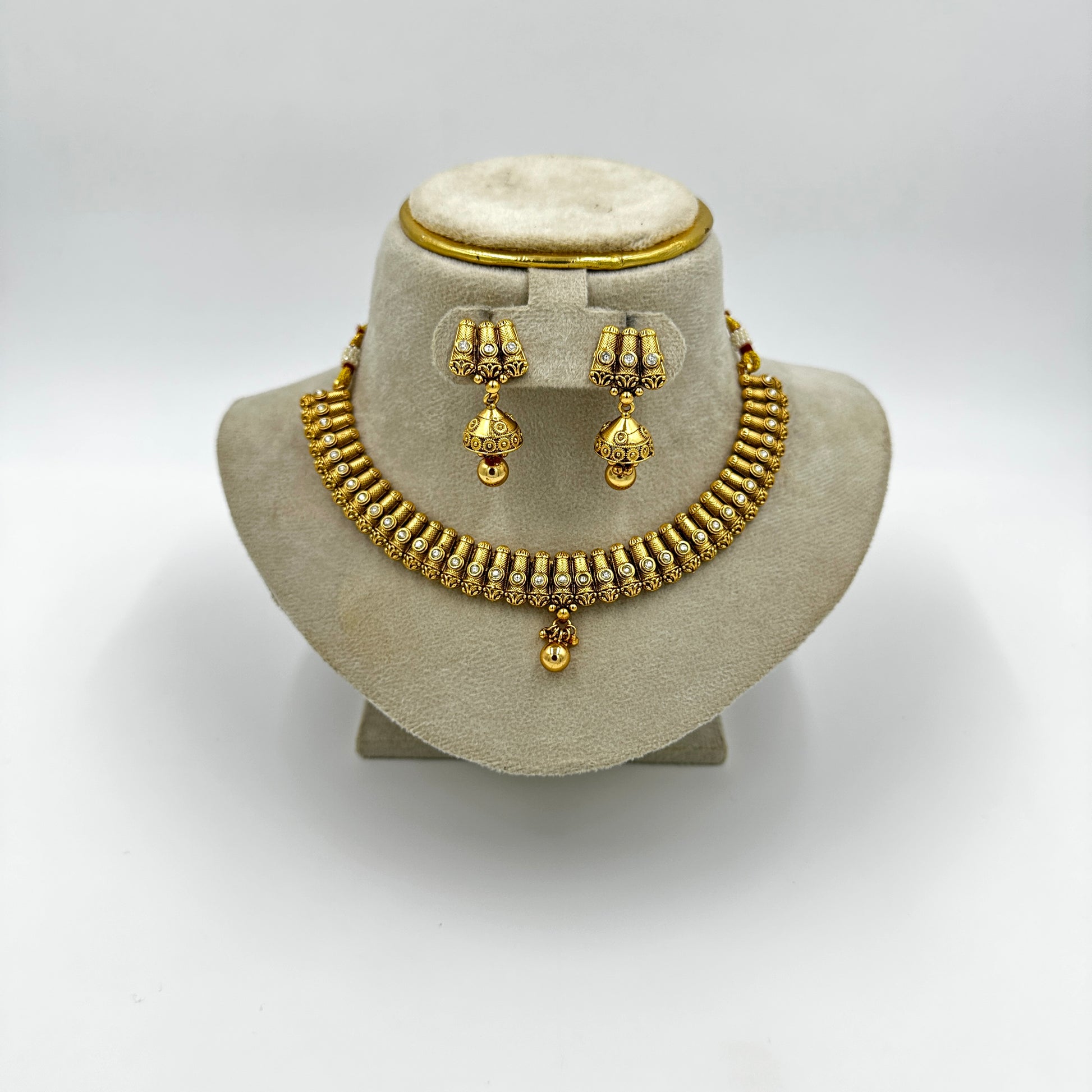 Add timeless elegance to your ethnic look with this beautifully crafted gold-plated choker necklace set. Adorned with antique-style detailing and shimmering stones, the necklace is paired with matching jhumka earrings that complete the traditional charm. Perfect for weddings, festive occasions, and cultural celebrations.