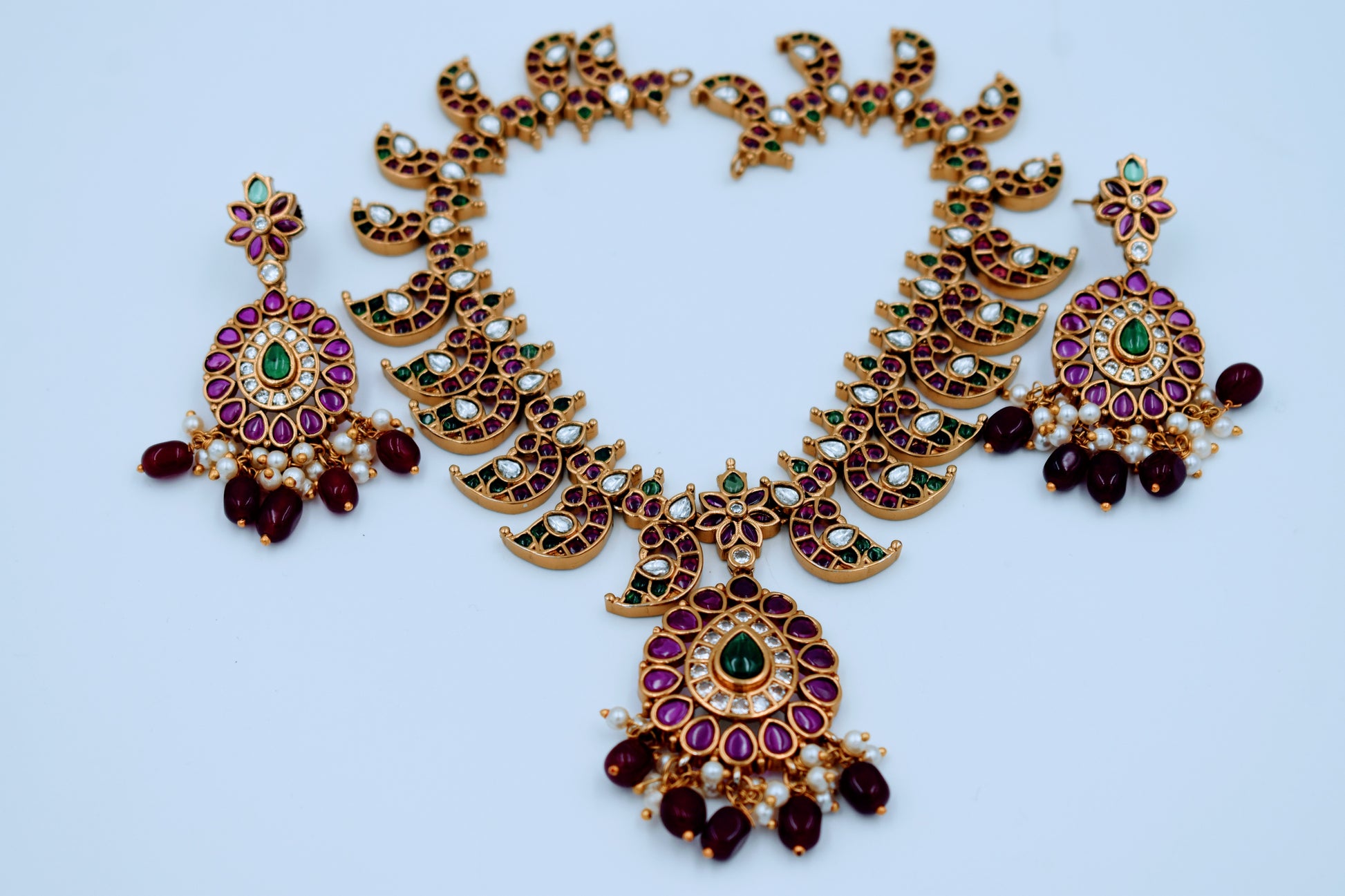 This necklace set features a stunning combination of ruby red, emerald green, and white kundan stones, beautifully arranged in a half-moon pattern. Paired with matching statement earrings, this piece perfectly complements traditional and ethnic outfits.